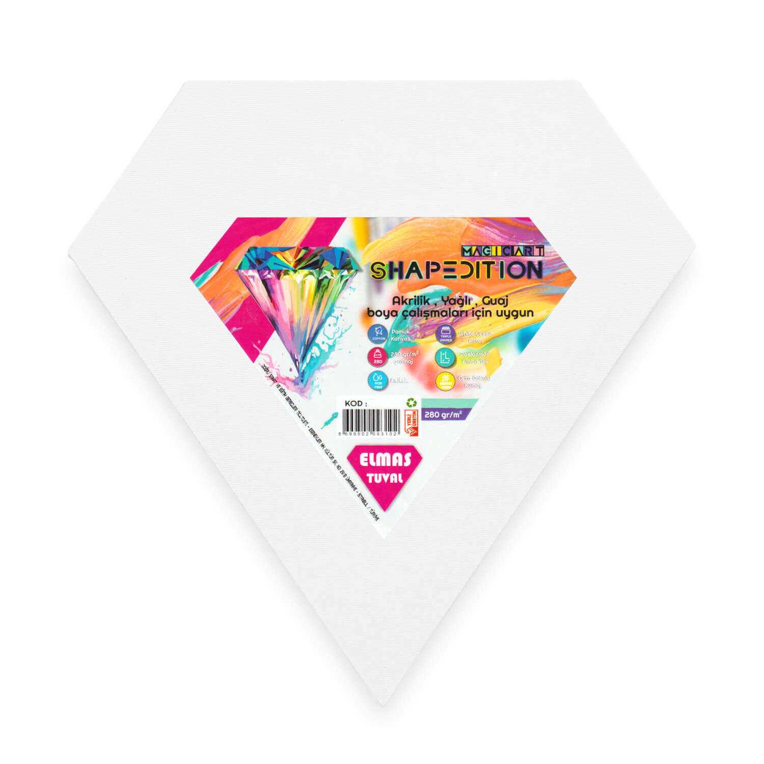 Magic Art Elmas Şekilli Tuval, sağlam ve dayanıklı yapısı ile uzun ömürlü kullanım sunar. Yüksek kaliteli malzemelerden üretilmiş olması, tuvalin zamanla bozulmadan kalmasını ve sanat eserlerinizin kalitesini korumasını sağlar. Hem akrilik hem de yağlı boyalar ile uyumludur.